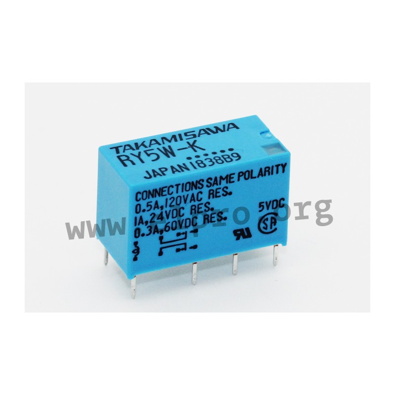 113592 RY5W-K RY-5W-K RY-5W-K Fujitsu/Takamisawa PCB relay series RY. Miniature PCB relays in a plastic enclosure with the contact form DPDT (2 form C) and the contact material AgPd (Au plated). These relays have low height of 12,5mm and a weight of 5g. Furthermore, they have a switching current of 2A, a power output of 150 to 300mW and are wash tight (RTIII). We offer the types RY5W-K, RY12W-K and RY24W-K. contact: DPDT (bifurcated)contact material: AgPd, Au platedrated current: 1Amaximal switching voltage: 120V AC / 60V DCmaximal switching power: 62,5VA / 24Woperate/release time: 6/3mstesting voltage (FCC) coil/contact:(1min.): 1000V ACtesting voltage open contacts(1min.): 500V ACminimal mechanical lifetime: 20x106 operationsminimal electrical lifetime: 200x103 operations (0,5A, 120V AC)operating temperature: -30 to +90°Cweight (approximately): 5g