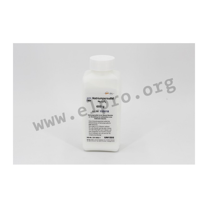 Neutral smelling, transperent, and lightly soluble in water caustic sodium persulfate etching fluid for etching Cu PCBs in etching tanks. We offer the following types of this Gie-Tec series: 152 018, 152 012, and 152 017.