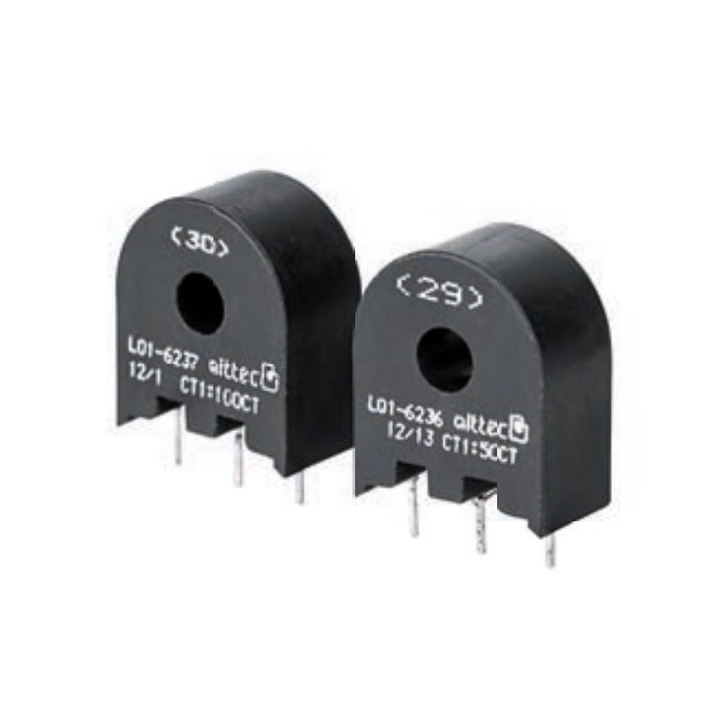 Current transformers in a plastic case with a centerhole for a current-carrying wire. By increasing the number of the primary turns the measurement accuracy can be improved. These devices with an operating temperature range of -40°C to +120°C are fully potted and suited for PCB mounting. They have a current range of 1A to 200A and a tolerance of ±10%, the models of the series 62 have a secondary current of 30mA to 300mA.
