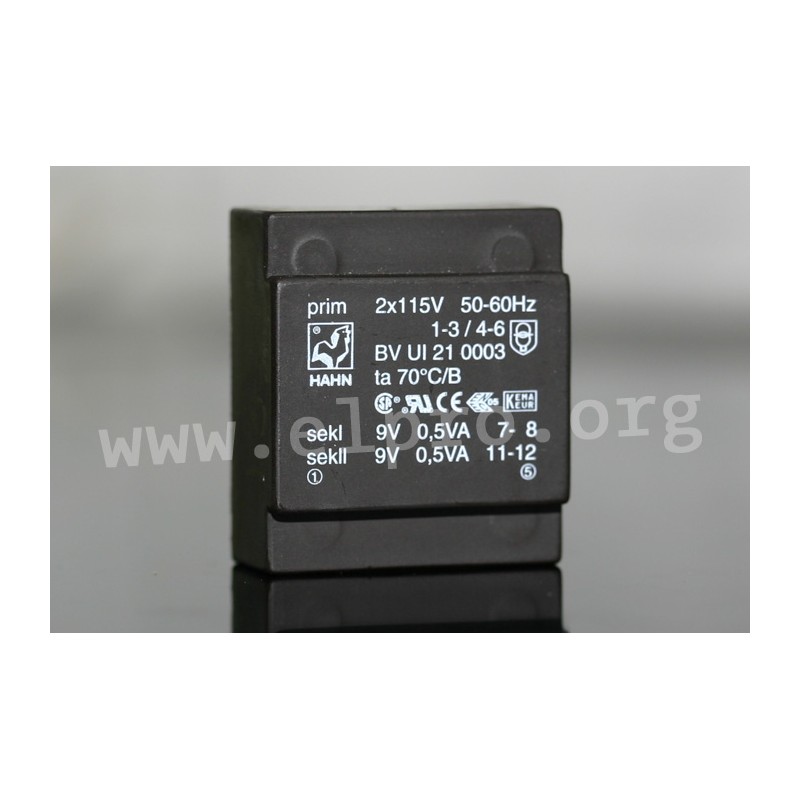 29234 BV UI 21 0003 BVUI210003 BVUI210003 Hahn flat transformers . Vacuum encapsulated flat transformers with 1VA and a UI21 core. These components are short circuit proof and suitable for PCB mounting. They comply with EN61558 as well as VDE 0570 and have double primary as well as secondary windings and are suitable for 115V as well as 230V power supplies. We offer the following types of this Hahn series: BV UI 21 0002, BV UI 21 0003, BV UI 21 0004 and BV UI 21 0005. core: UI 21 output: 1VA input voltage: 2x115V short circuit proof