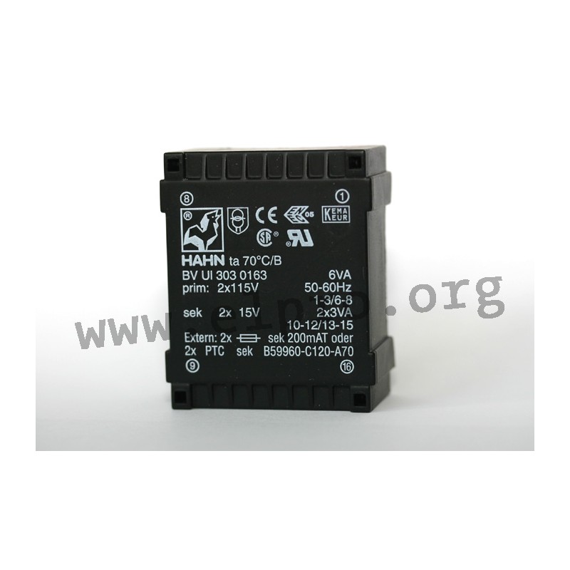 29321 BV UI 303 0163 BVUI3030163 BVUI3030163 Hahn flat transformers. Flat transformers with 3 to 6VA and a UI30 core. These transformers are vacuum encapsulated, have a two chamber winding and at least 10mm sparking/leakage distance in the air. They 100% tested at 6000V between primary as well as secondary winding and are suitable for PCB mounting as well as for 115/230V power supplies. We offer various types of this Hahn series. output: 3 to 6VA core: UI 30 not short circuit proof