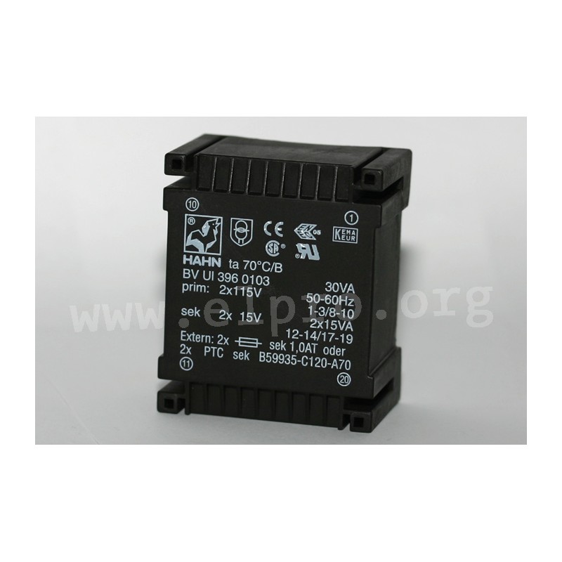 Vacuum encapsulated flat transformers with 30VA, a UI39 core and a two chamber winding. These transformers are fully tested with 6000V between primary/secondary winding and have at least 10mm leakage/sparking distance in air. They are suitable for PCB mounting as well as for 115/230V power supplies and are not short circuit proof. We offer the following types of this Hahn series: BV UI 396 0102, BV UI 396 0079 and BV UI 396 0103.