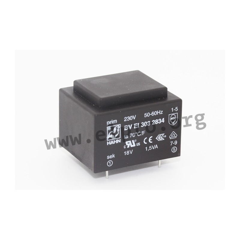 Transformers in a vacuum casted housing with 1,5VA and an EI 30 core. These devices are short circuit proof and comply with temperature resistance class Ta 70/F. They are suitable for PCB mounting. We offer the following types of this Hahn series: BV EI 302 2020, BV EI 302 2021, BV EI 302 2022, BV EI 302 2023, BV EI 302 2024, BV EI 302 2989, BV EI 302 2025, BV EI 302 2026, BV EI 302 2027, BV EI 302 2028, BV EI 303 2834 and BV EI 303 2875.