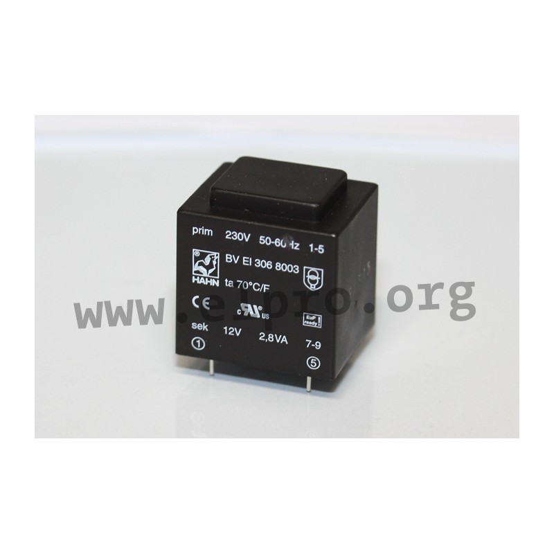 Transformers with 2,8VA and an EI30 core. These devices have a low no-load power loss (<0,4W) and comply with temperature resistance class Ta 70/F. They are short circuit proof and suitable for PCB mounting. We offer the following types of this Hahn series: BV EI 306 8016, BV EI 306 8017 and BV EI 306 8003.
