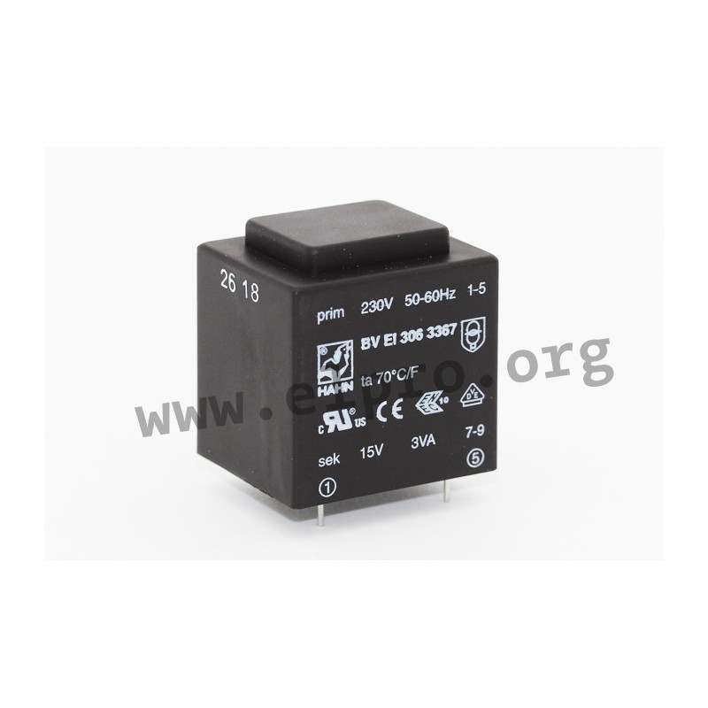Transformers with 3VA and an EI30 core. These devices are short circuit proof and suitable for PCB mounting. They comply with temperature resistance class Ta 40/F and are vacuum casted. We offer various types of this Hahn series.