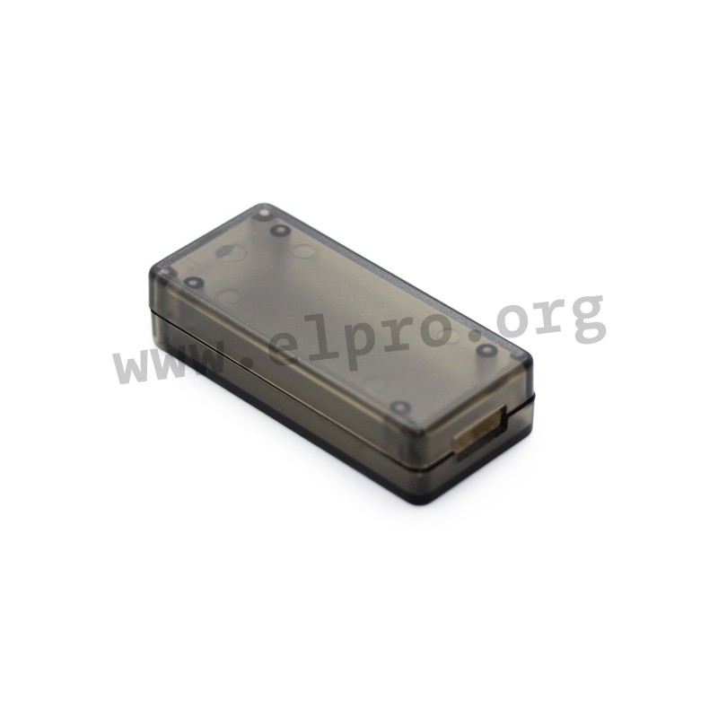 ABS plastic (UL94-HB) miniature USB enclosures in grey, black or transparent (clear, red or smoked), ideally suited for dongles or the mounting of small PCBs with USB connectors. These housings comply with IP54. Two or four PCB standoffs are molded into the interior depending on the selected size. The lid is secured with self tapping screws and the cover is recessed for an easier label installation.