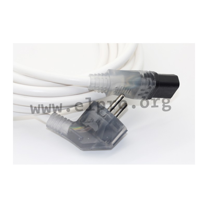 PVC power supply cables in white, with a moulded angle plug with earthing contact (16A/250V, IEC884-1/DIN 49441 R2) and a straight C13 appliance connector (10A/250V, EN60320-1). They are suitable for medical technology, double insulated, comply with HWN B14B0296, as well as they are individually and visually tested according to VDE requirements. We offer various types of this Hawa series.
