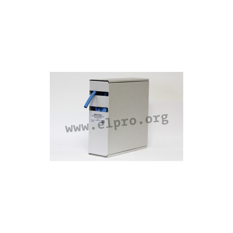 253230 S 19mm 2:1 5m blau SBOX191BL SBOX191BL polyolefin heat-shrinkable tubing series SBOX. Thin walled radiation-interlaced polyolefin-shrinkable tubing in dispenser boxes of 5, 8, or 10m. These tubings have a schrinkage rate of 2:1 and they are self-extinguishing, as well as flame retardant. We offer diverse types of this series. continuous operating temperature: -55 to +125°C minimum shrink temperature: 120°C dielectric strength, min.: 20kV/mm