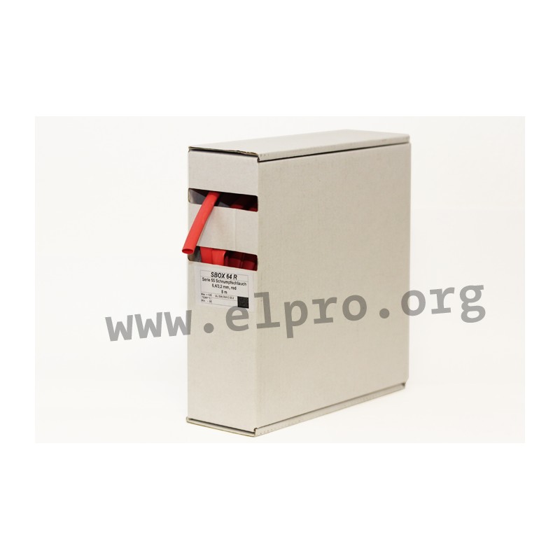 29743 S 6,4mm 2:1 8m rot SBOX64R SBOX64R polyolefin heat-shrinkable tubing series SBOX. Thin walled radiation-interlaced polyolefin-shrinkable tubing in dispenser boxes of 5, 8, or 10m. These tubings have a schrinkage rate of 2:1 and they are self-extinguishing, as well as flame retardant. We offer diverse types of this series. continuous operating temperature: -55 to +125°C minimum shrink temperature: 120°C dielectric strength, min.: 20kV/mm