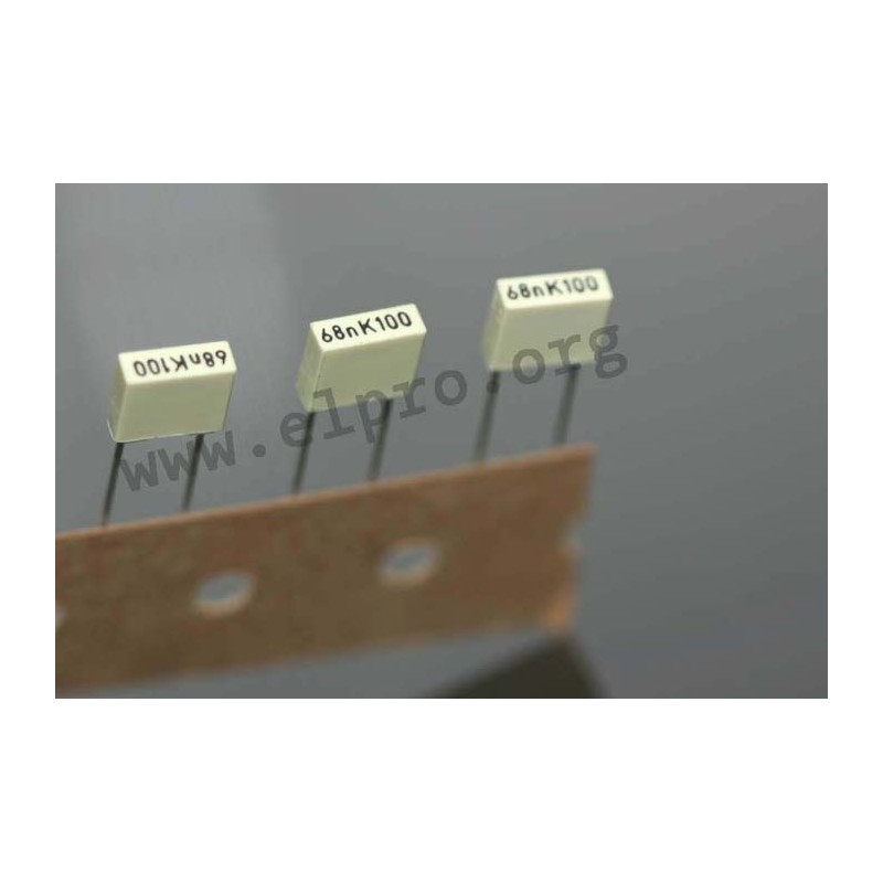 27930MKT RM5 100V 6800pF Gurt R82EC1680DQ50KR82EC1680DQ50Kpitch: 5mm. * dielectric, polyester film (polyethylene terephthalate)* box material is solvent resistant and flame retardant according to UL94V-0* tinned wire leads* low attenuation* high pulse rating
