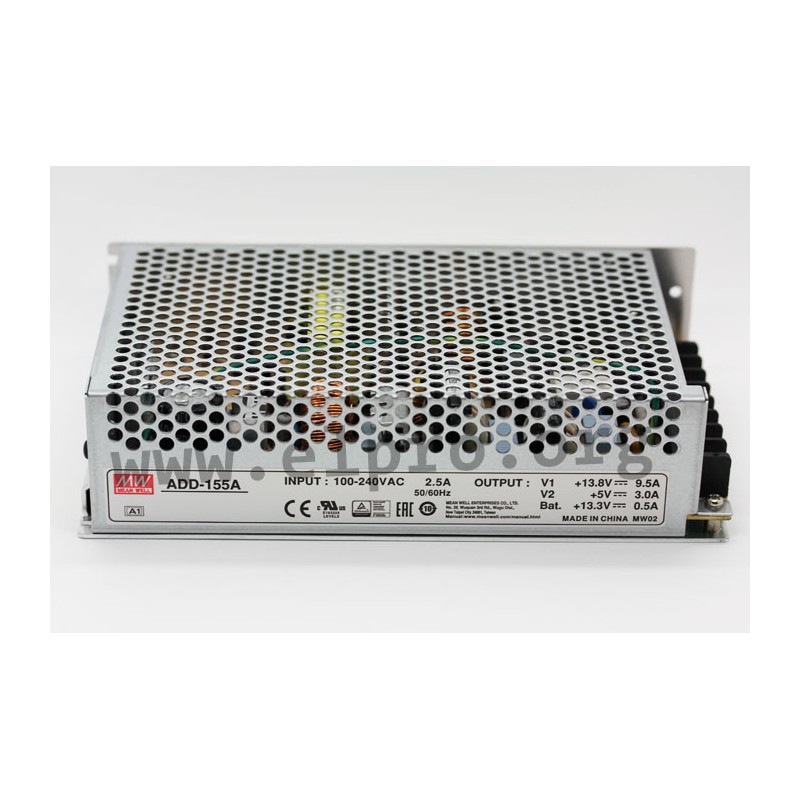 Switching power supplies in an enclosed housing with 155W, a universal input, screw terminals, a battery charger and a dual output. These devices have a built-in active PFC function and are protected against overload (auto recovery), overvoltage as well as short circuit. They have a UPS function and comply with UL60950-1, EN60950-1 as well as EN55032 class B. We offer the following types of this Mean Well series: ADD-155A and ADD-155B.