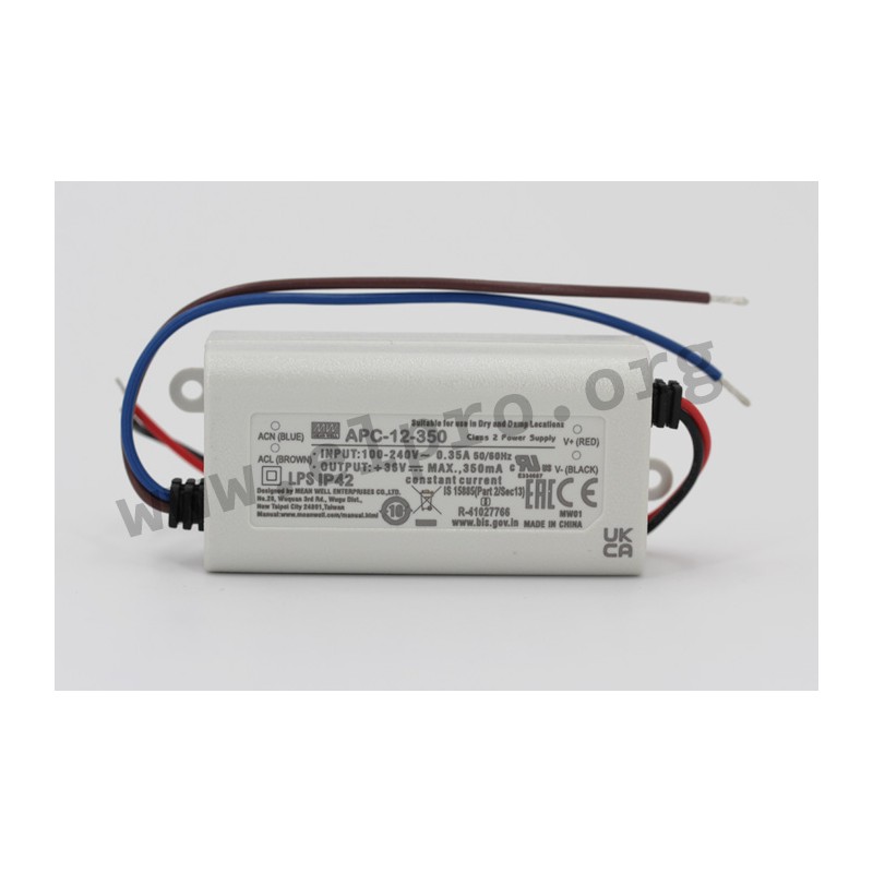 LED drivers in a plastic housing (IP42) with a constant current, a universal input and 12W. These devices are protected against overvoltage as well as short circuit and comply with UL8750. They are suitable for LED lighting applications and are not dimmable. We offer the following types of this Mean Well series: APC-12-350 and APC-12-700.