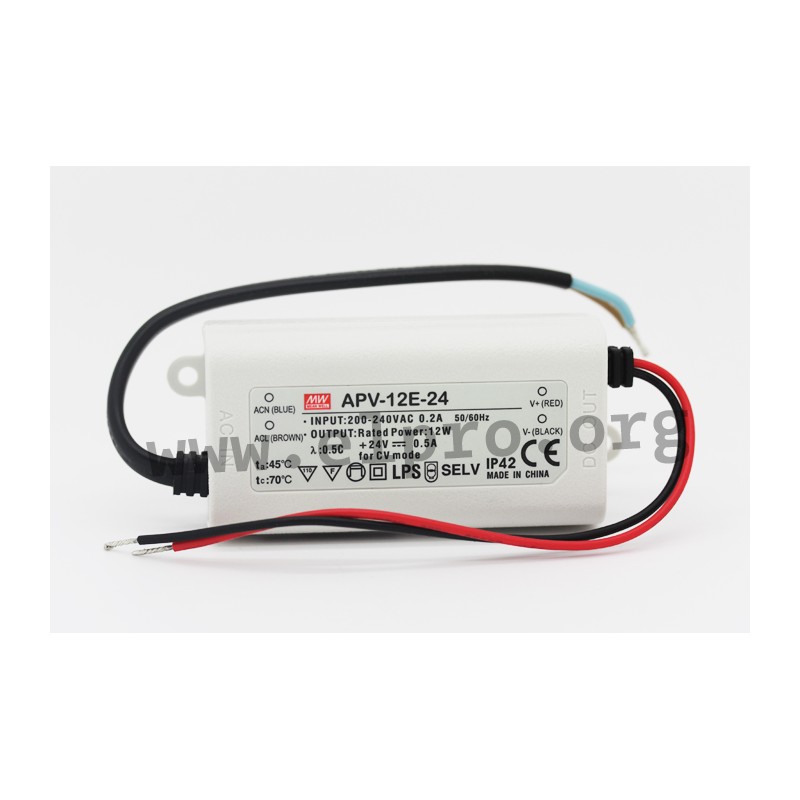 LED drivers in a plastic housing (IP42) with a universal input, 12W and a constant voltage. These devices are suitable for LED lighting applications and are not dimmable. They are suitable for overload (auto recovery), overvoltage as well as short circuit and comply with EN55032. We offer the following types of this Mean Well series: APV-12E-12, APV-12E-15 and APV-12E-24.