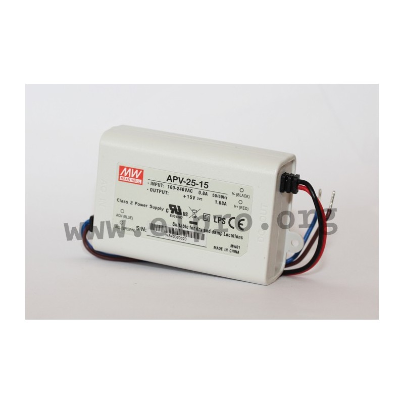 LED drivers in a plastic housing (IP42) with a constant voltage, 25W and a universal input. These devices are protected against overload (auto recovery), short circuit as well as overvoltage and are suitable for LED lighting applications. They comply with UL8750 as well as EN55032 and are not dimmable. We offer the following types of this Mean Well series: APV-25-5, APV-25-12, APV-25-15, APV-25-24 and APV-25-36.