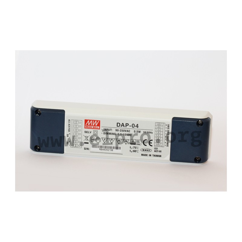 DALI-PWM converters with a universal input, a low no-load power, a push dimming function and a built-in relay for ON/OFF control of LED drivers. These devices have 4 (DAP-04) resp. 1 or 4 addressable output channels (DAP-04-S01) and comply with IEC62386-101, 102, 207 (DALI standard). They are suitable for converting a DALI signal into a PWM signal and have a linear as well as a logarithmic dimming curve that can be set according to 62386-207. Furthermore, PWM "active high" or PWM "active low" can be selected by a jumper. We offer the types DAP-04 and DAP-04-S01 of this Mean Well series.