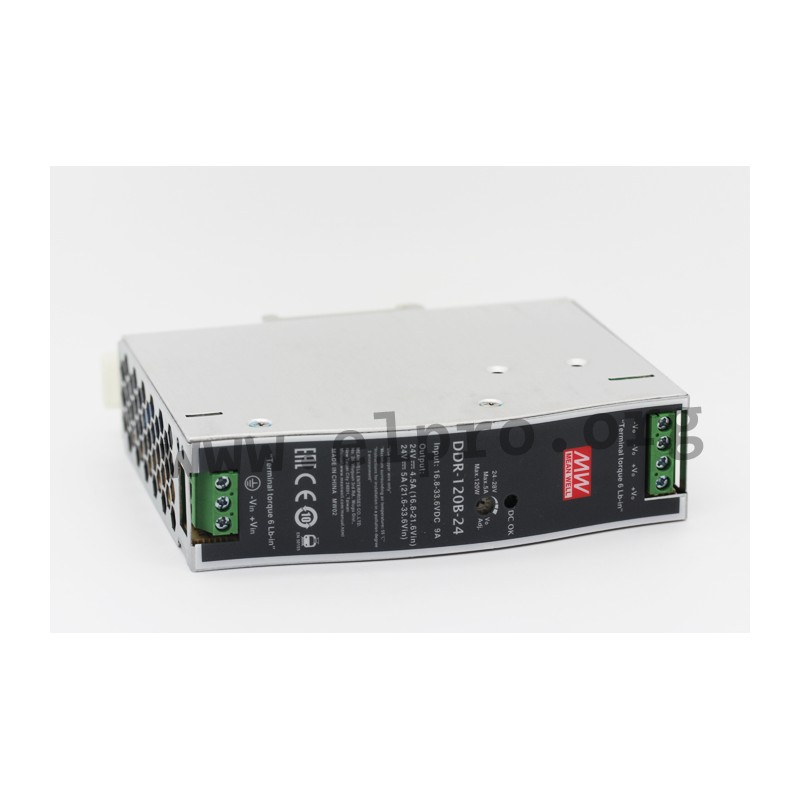 DC/DC converters in a DIN rail housing (TS-35/7.5 or 15) with 120W, an input voltage ratio of 2:1, a small width (32mm) and an adjustable DC output. These devices have a fanless design and are protected against overload, input voltage reversal, overvoltage as well as short circuit. They have a peak load capability of 150% and comply with EN55032 class B, IEC62368-1 as well as UL62368-1. We offer the following types of this Mean Well series: DDR-120A-12, DDR-120A-24, DDR-120A-48, DDR-120B-12, DDR-120B-24, DDR-120B-48, DDR-120C-12, DDR-120C-24, DDR-120C-48, DDR-120D-12, DDR-120D-24 and DDR-120D-48.