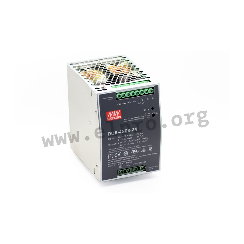 Converter modules in a DIN rail housing (TS-35/7.5 or 15) with 480W, an input voltage ratio of 2:1, 150% peak load capability and a regulated output voltage. These devices have a fanless design (cooling by free air convection) and are protected against short circuit, overload, overvoltage, overtemperature as well as voltage reversal. They have a width of 85,5mm and comply with EN55032 class A, UL62368-1 as well as IEC62368-1. We offer the following types of this Mean Well series: DDR-480B-12, DDR-480B-24, DDR-480B-48, DDR-480C-12, DDR-480C-24, DDR-480C-48, DDR-480D-12, DDR-480D-24 and DDR-480D-48.