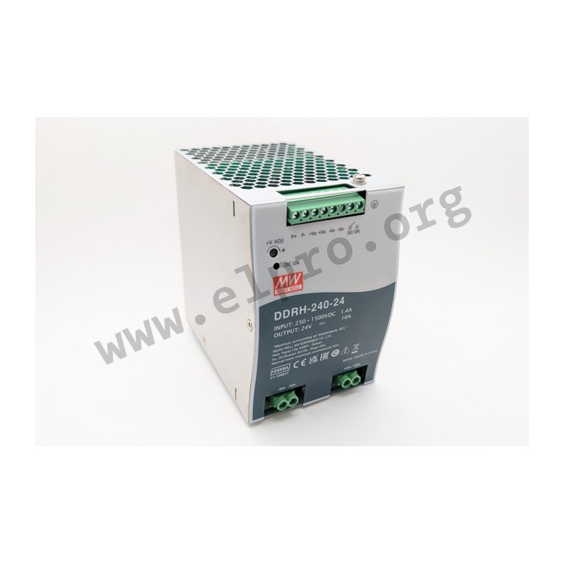 DC/DC converters in a DIN rail housing (TS-35/7.5 or 15) with a built-in EMI filter and a trimming output (±10%). These devices have a fanless design and are protected against overload, overvoltage, overtemperature as well as short circuit. They have a width of only 85,5mm and comply with IEC 62109-1, EN 62109-1 as well as EN55032 Klasse A. We offer the following types of this Mean Well series: DDRH-240-12, DDRH-240-24, DDRH-240-32 und DDRH-240-48.