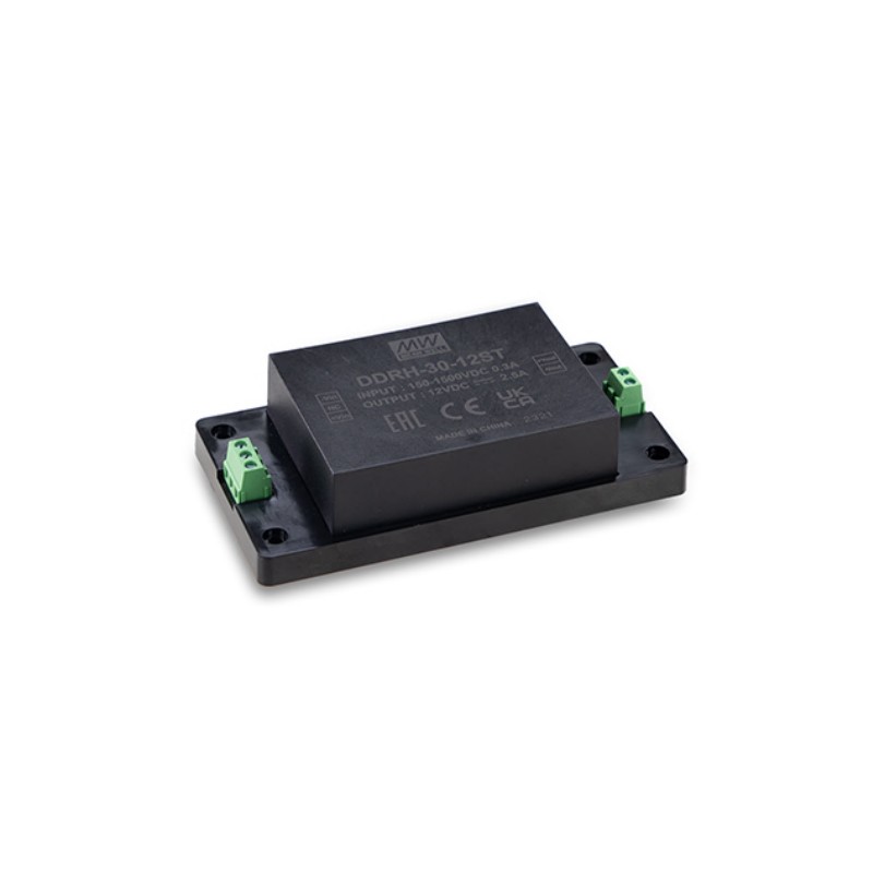 DC/DC converters in an enclosed housing with 30W and screw terminals. These devices have a wide input voltage range (10:1) and are suitable for an operating altitude of up to 5000m. They are protected against overload, voltage reversal, overvoltage as well as short circuit and comply with IEC62109-1 as well as EN55032 class A. We offer the following types of this Mean Well series: DDRH-30-12ST, DDRH-30-15ST, DDRH-30-24ST and DDRH-30-48ST.