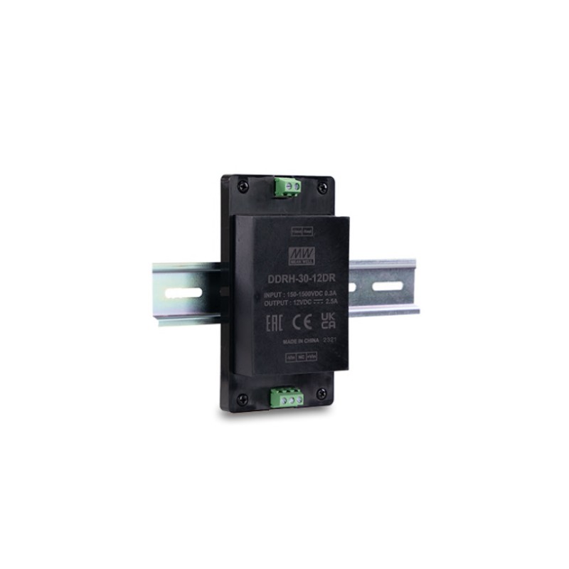 DC/DC voltage converters in a DIN rail housing (TS-35/7,5 or 15) with 30W and an ultra wide input voltage range. These devices have screw terminals and are suitable for an operating altitude of up to 5000m. They are protected against overload, overvoltage, short circuit as well as voltage reversal and comply with IEC62109-1 as well as EN55032 class A. We offer the following types of this Mean Well series: DDRH-30-12DR, DDRH-30-15DR, DDRH-30-24DR and DDRH-30-48DR.