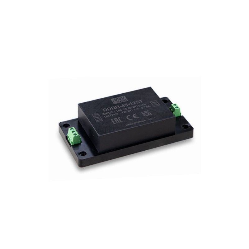 DC/DC voltage converters in an enclosed housing with 45W and screw terminals. These devices are suitable for an operating altitude of up to 5000m and have an ultra wide input voltage range (10:1). They are protected against overload, short circuit, voltage reversal as well as overvoltae and comply with EN55032 class A as well as IEC62109-1. We offer the following types of this Mean Well series: DDRH-45-12ST, DDRH-45-15ST, DDRH-45-24ST and DDRH-45-48ST.