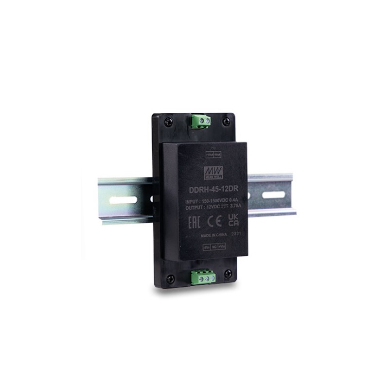 DC/DC converters in a DIN rail housing (TS35/7,5 or 15) with 45W and screw terminals. These devices are suitable for an operating altitude of up to 5000m and have an ultra wide input voltage range (10:1). They have a fanless design, comply with EN55032 class A as well as IEC62109-1 and are protected against overload, voltage reversal, short circuit as well as overvoltage. We offer the following types of this Mean Well series: DDRH-45-12DR, DDRH-45-15DR, DDRH-45-24DR and DDRH-45-48DR.