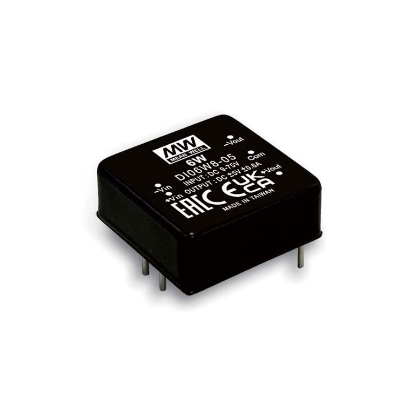 DC/DC converter modules in a 1"x1" housing with 6W, a regulated output voltage and an input voltage ratio of 8:1. These devices are suitable for PCB mounting and are protected against overload, overvoltage as well as short circuit (continuous). They do not require a minimum load and comply with EN5032 class A as well as EN55032 class B. We offer the following types of this Mean Well series: DI06W8-05, DI06W8-12 and DI06W8-15.