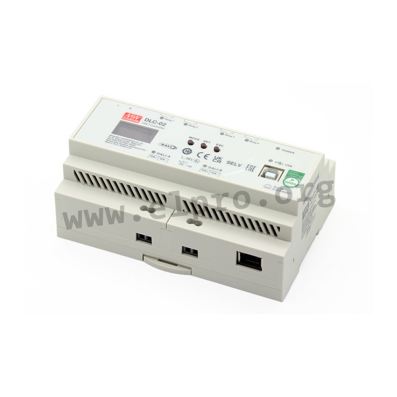 DALI-2 controllers/monitor units with 4 relays, an LCD display, LED indicators and buttons for local operation. These devices have a maximum of 16 scenes as well as group settings per channel and comply with EN55015 as well as EN61547-1. In addition to a DALI-2 interface they also feature a USB interface and are suitable for complex control effects based on input devices and time events. We offer the type DLC-02 of this Mean Well series.