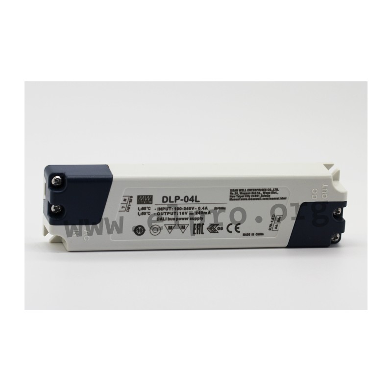 These power supplies with a universal input are intended for DALI-Bus systems and conform to isolation class II. They are protected against short circuit (current limiting, auto recovery) as well as overvoltage (300V AC/5s). We offer the type DLP-04R with a compact size suited for DIN rail mounting 2SU (35mm) and the type DLP-04L in an enclosed case for linear mounting.