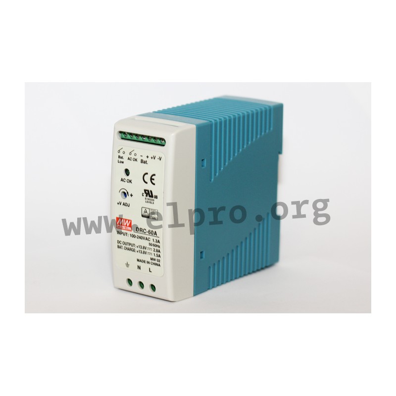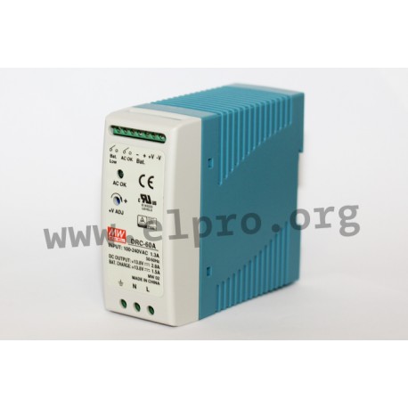 Switching power supplies in a DIN rail housing with 60W, a battery charger, a power fail signal, a battery low signal, an LED indicator for power on, screw terminals (touch guard) and a universal input. These devices have a fanless design, are protected against voltage reversal (by fuse), overload (auto recovery), overvoltage as well as short circuit and comply with UL/EN62368-1, EN55032 class B, EN61000-3-2 as well as EN61000-3-3. We offer the following types of this Mean Well series: DRC-60A and DRC-60B.