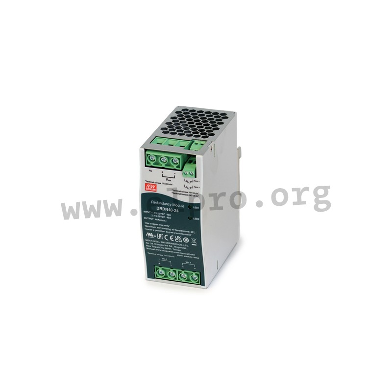 Redundancy modules in an enclosed housing (55mm width) with 40A, a 1 channel output, a 2 channel input, an LED indicator and a DC OK / alarm relay contact. These devices are suitable for 1+1 as well as N+1 redundancy systems and are protected against overload as well as short circuit. They are suitable for direct DIN rail mounting and comply with UL62368-1, EN55032 class B as well as EN61000-4-2. We offer the following types of this Mean Well series: DRDN40-12, DRDN40-24 and DRDN40-48.