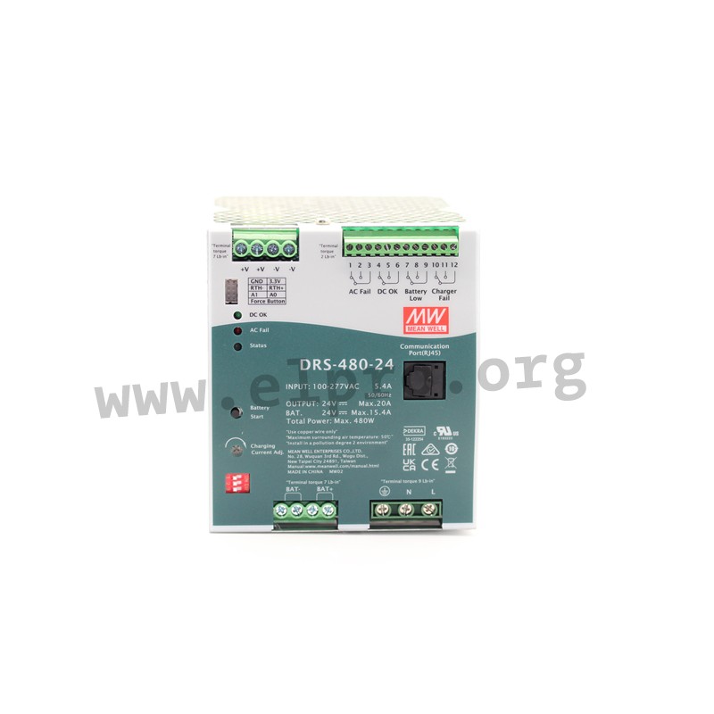 Switching power supplies in a DIN rail housing with 480W, a universal input, a MODBus interface and relay contacts / LED indicators for AC fail, battery low, charger fail as well as DC OK. These devices have a 2- or 3-stage charging curve (selectable through a DIL switch) and are protected against overload, deep discharge, voltage reversal, short circuit as well as overvoltage. They have a UPS function (with a battery charger) and comply with EN62368-1, EN55032 class B as well as EN61000-3-2. We offer the following types of this Mean Well series: DRS-480-24, DRS-480-36 and DRS-480-48.