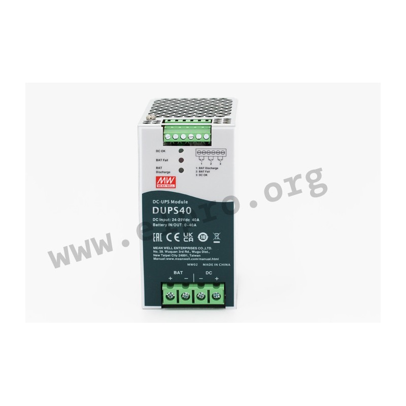 DC UPS controllers in a DIN rail housing with 40A and an LED status indicator. These devices are suitable for 24V systems and are protected against short circuit, battery discharge, over discharge current as well as voltage reversal. They have a fanless design, are suitable for lead-acid batteries (4 to 135Ah) and comply with EN55032 class B. We offer the type DUPS40 of this Mean Well series.