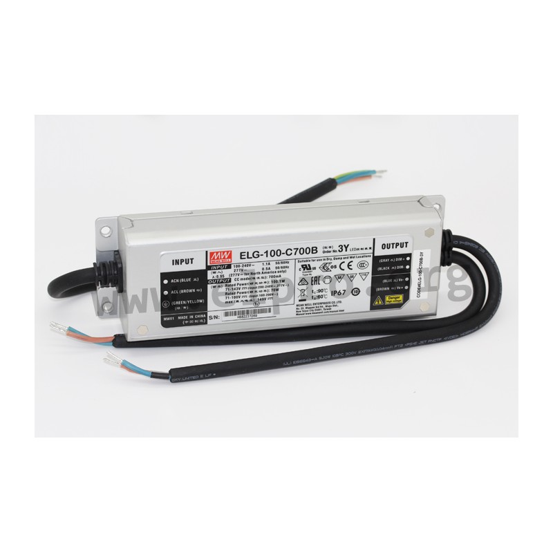 LED drivers in a metal case (IP67) with a constant current, a protective earth conductor PE, 100W and a 3 in 1 dimming function (0 to 10V DC, PWM, 100kOhm potentiometer). These devices comply with EN61347-1, EN61347-2-13, EN55015, EN61000-3-2 class C, EN61000-3-3, EN61547 as well as a 6kV surge immunity level and are suitable for LED lighting applications. They are protected against short circuit, overload (auto recovery), overvoltage as well as overtemperature and have a built-in active PFC function. We offer the following types of this Mean Well series: ELG-100-C350B-3Y, ELG-100-C500B-3Y, ELG-100-C700B-3Y, ELG-100-C1050B-3Y and ELG-100-C1400B-3Y.