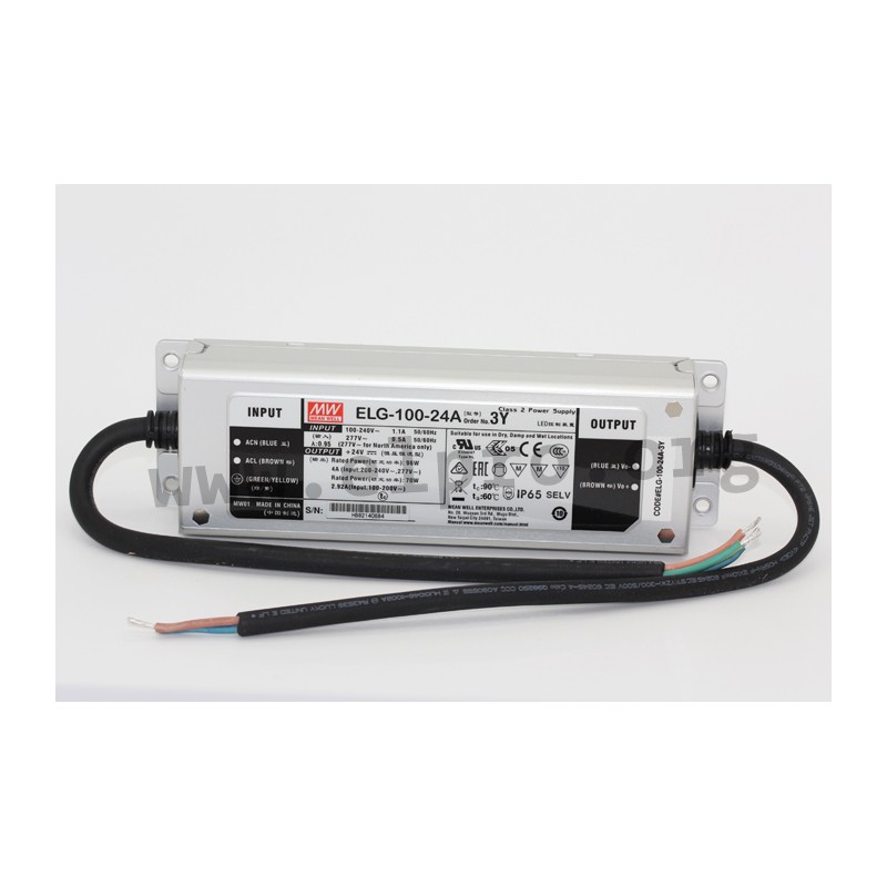 LED drivers in a metal housing (IP65) with a constant current / constant voltage (mixed mode), a protective earth conductor PE and 100W. These devices are SELV compliant and comply with EN61347-1, EN61347-2-13, EN55015, EN61000-3-2 Class C, EN61000-3-3 as well as EN61547. They are protected against overload (auto recovery), overtemperature, short circuit as well as overvoltage and have a built-in active PFC function as well as a built-in potentiometer for adjusting the output voltage / current limitation. We offer the following types of this Mean Well series: ELG-100-24A-3Y, ELG-100-36A-3Y, ELG-100-42A-3Y, ELG-100-48A-3Y and ELG-100-54A-3Y.