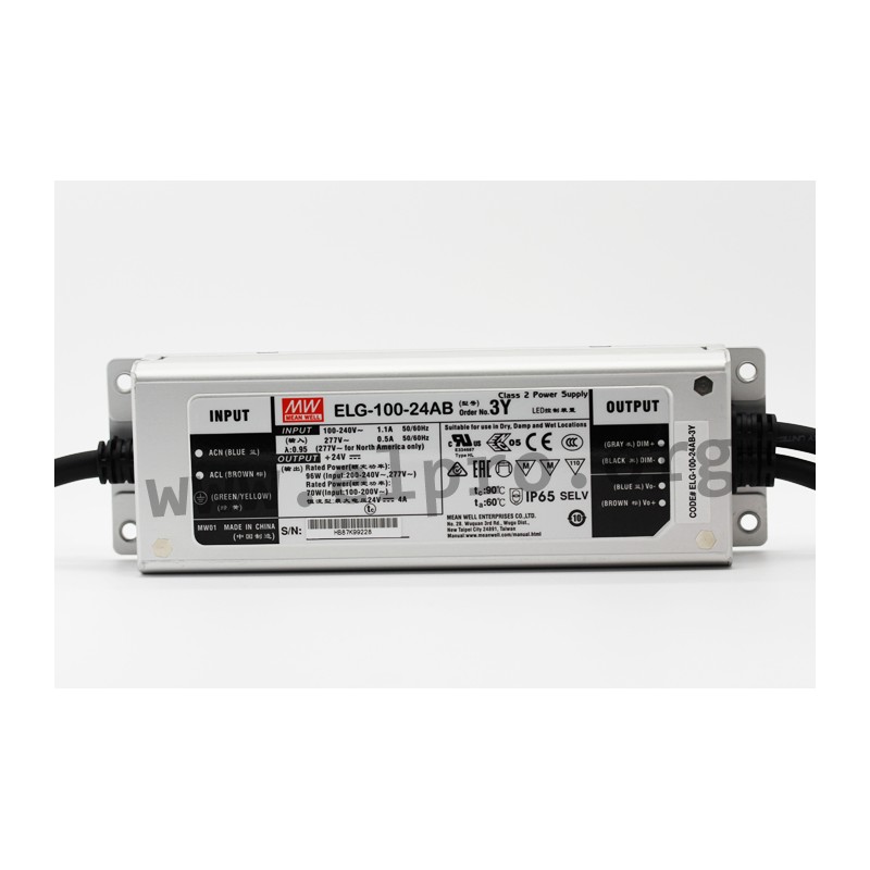 These devices are suitable for LED lighting applications and are not dimmable.LED drivers in a metal housing (IP65) with a constant current / constant voltage, a 3 in 1 dimming function (0 to 10V DC, PWM, 100kOhm potentiometer), a protective earth conductor PE and 100W. These devices comply with EN61347-1, EN61347-2-13, EN55015, EN61000-3-2 class C, EN61000-3-3, EN61547 as well as 6kV surge immunity level and are protected against overload (auto recovery), overtemperature, short circuit as well as overvoltage. They have a built-in potentiometer for adjusting the output voltage / current limitation as well as a built-in active PFC function and are suitable for LED lighting applications. We offer the following types of this Mean Well series: ELG-100-24AB-3Y, ELG-100-36AB-3Y, ELG-100-42AB-3Y, ELG-100-48AB-3Y and ELG-100-54AB-3Y.