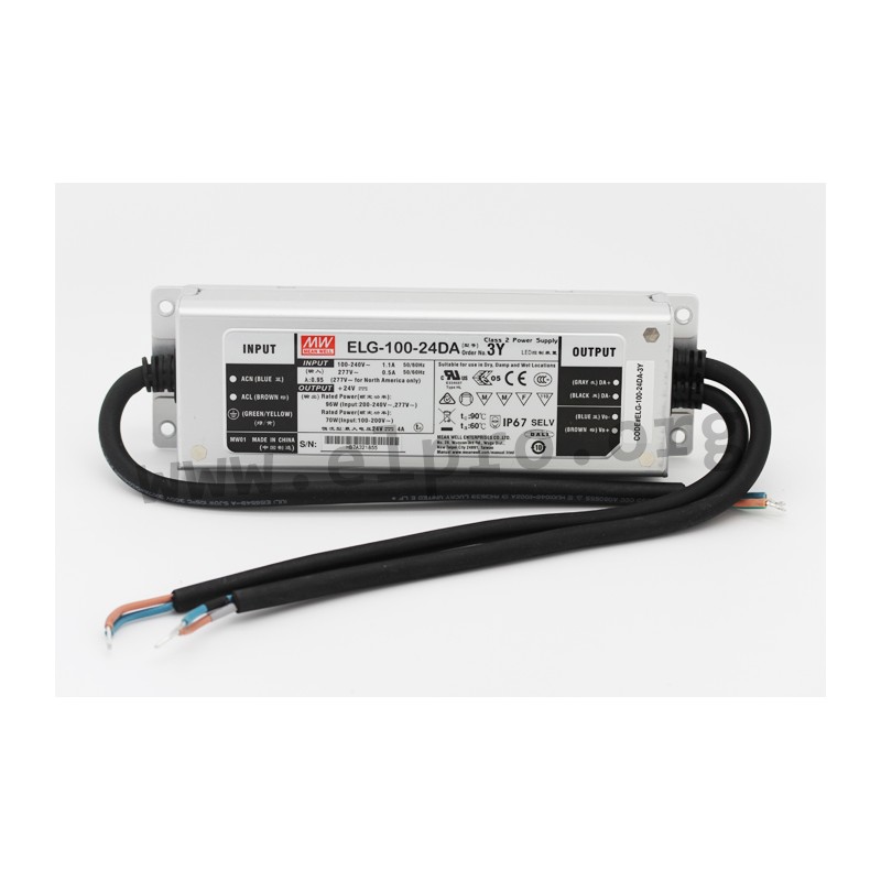 LED drivers in a metal housing (IP67) with a constant current / constant voltage (mixed mode), 100W and a DALI interface. These devices are protected against overload (auto recovery), overtemperature, overvoltage as well as short circuit and comply with EN61347-1, EN61347-2-13, EN55015, EN61000-3-2 class C, EN61000-3-3, EN61547 as well as 6kV surge immunity level. They are suitable for LED lighting applications and have a built-in active PFC function. We offer the following types of this Mean Well series: ELG-100-24DA-3Y, ELG-100-36DA-3Y, ELG-100-42DA-3Y, ELG-100-48DA-3Y and ELG-100-54DA-3Y.