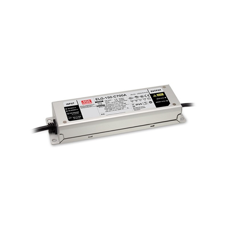 LED drivers in a metal housing (IP67) with 150W, a constant current and a protective earth conductor (PE). These SELV compliant devices have a built-in active PFC function and are protected against overload (auto recovery), overtemperature, overvoltage as well as short circuit. They are suitable for LED lighting applications, have a fixed output current and comply with EN61347-1, EN61347-2-13, EN55015, EN61000-3-2 class C, EN61000-3-3 as well as EN61547. We offer the following types of this Mean Well series: ELG-150-C500-3Y, ELG-150-C700-3Y, ELG-150-C1050-3Y, ELG-150-C1400-3Y, ELG-150-C1750-3Y and ELG-150-C2100-3Y.