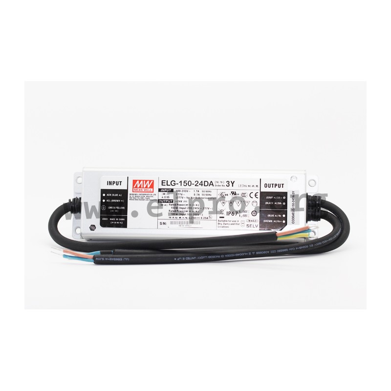 LED drivers in a metal housing (IP67) with a DALI interface, a constant voltage, a protective earth conductor PE and 150W. These SELV compliant devices comply with EN61347-1, EN61347-2-13, 6kV surge immunity level, EN55015, EN61547, EN61000-3-2 class C as well as EN61000-3-3 and are protected against overload (auto recovery), short circuit, overtemperature as well as overvoltage. They have a built-in active PFC function and are suitable for LED lighting applications. We offer the following types of this Mean Well series: ELG-150-12DA-3Y, ELG-150-24DA-3Y, ELG-150-36DA-3Y, ELG-150-42DA-3Y, ELG-150-48DA-3Y and ELG-150-54DA-3Y.