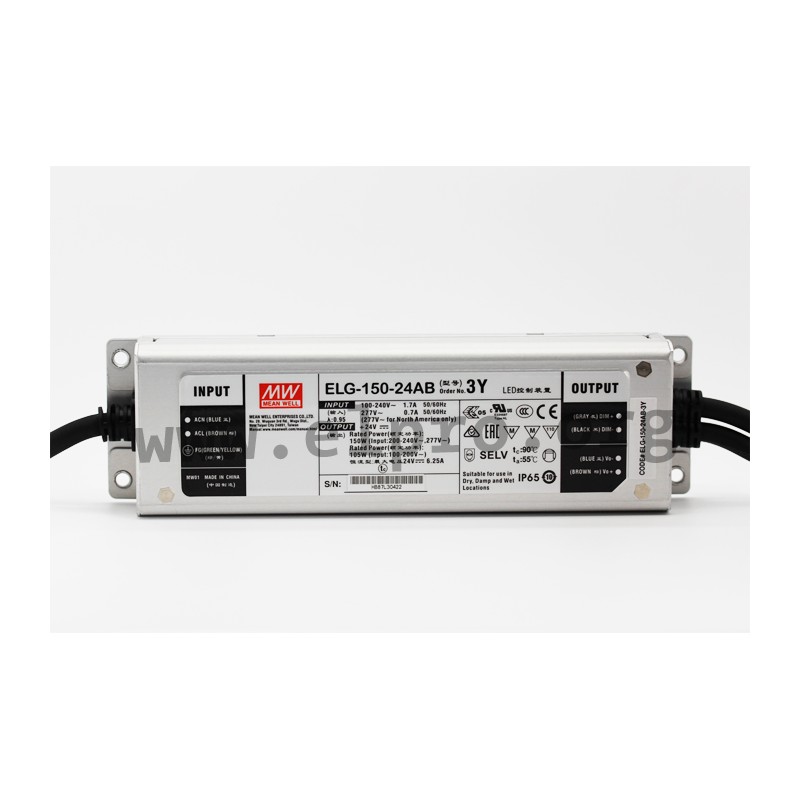 LED drivers in a metal housing (IP65) with a 3 in 1 dimming function (0 to 10V DC, PWM, 100kOhm potentiometer), a constant voltage, a constant current and a protective earth conductor PE. These devices are protected against overload (auto recovery), overtemperature, overvoltage as well as short circuit and comply with EN61347-1, EN61347-2-13, 6kV surge immunity level, EN55015, EN61000-3-2 class C, EN61000-3-3 as well as EN61547. They are suitable for LED lighting applications and have a built-in potentiometer for adjusting the output voltage / current limitation as well as a built-in active PFC function. We offer the following types of this Mean Well series: ELG-150-12AB-3Y, ELG-150-24AB-3Y, ELG-150-36AB-3Y, ELG-150-42AB-3Y, ELG-150-48AB-3Y and ELG-150-54AB-3Y.