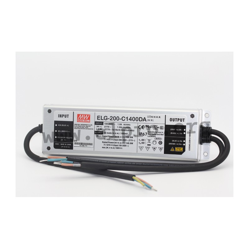 LED drivers in a metal case (IP67) with a constant current, a protective conductor PE (three wire primary cable) and 200W. These devices are protected against short circuit, overload (auto recovery), overvoltage and overtemperature and comply with EN61347-1, EN61347-2-13, EN55015, EN61000-3-2 class C, EN61000-3-3, EN61547 as well as a 6kV surge immunity level. They are suitable for LED lighting applications and are suitable for LED lighting applications. We offer the following types of this Mean Well series: ELG-200-C700DA-3Y, ELG-200-C1050DA-3Y, ELG-200-C1400DA-3Y, ELG-200-C1750DA-3Y and ELG-200-C2100DA-3Y.