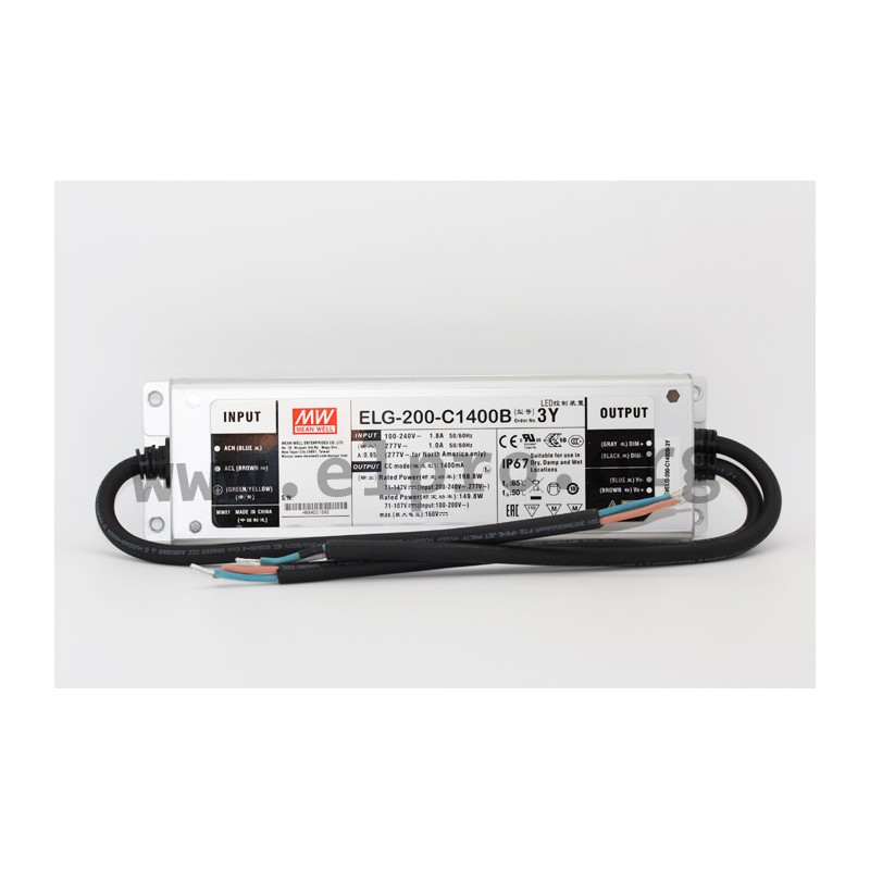 LED drivers in a metal case (IP67) with a fixed constant current, a 3 in 1 dimming function (0 to 10V DC, PWM, 100kOhm potentiometer) and a protective earth conductor PE (three wire primary cable). These SELV compliant devices comply with EN61347-1, EN61347-2-13, EN55015, EN61000-3-2 class C, EN61000-3-3, EN61547 and a 6kV surge immunity level and are suitable for LED lightning applications. They are protected against short circuit, overload (auto recovery), overvoltage as well as overtemperature and have a built-in active PFC function. We offer the following types of this Mean Well series: ELG-200-C700B-3Y, ELG-200-C1050B-3Y, ELG-200-C1400B-3Y, ELG-200-C1750B-3Y and ELG-200-C2100B-3Y.