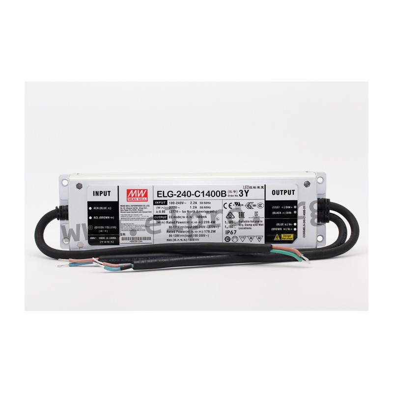 LED drivers in a metal case (IP67) with a constant current, 240W and a protective conductor PE (three wire primary cable). These SELV compliant devices are suitable for LED lighting applications, have a 3 in 1 dimming function (0 to 10V DC, PWM, 100kOhm potentiometer) through an executed control line and are protected against short circuit, overload (auto recovery), overvoltage as well as overtemperature. We offer the following types of this Mean Well series: ELG-240-C700B-3Y, ELG-240-C1050B-3Y, ELG-240-C1400B-3Y, ELG-240-C1750B-3Y and ELG-240-C2100B-3Y.