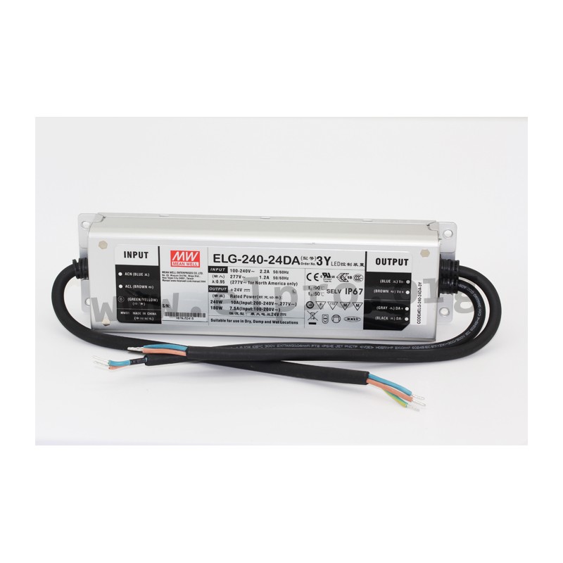 LED drivers in a metal housing (IP67) with a protective earth conductor PE, a constant voltage, 6kV surge immunity level and a DALI interface. These devices are protected against overload (auto recovery), overtemperature, short circuit as well as overvoltage and comply with EN61347-2-13, EN61347-1, EN55015, EN61000-3-3, EN61000-3-2 class C as well as EN61547. They are suitable for LED lighting applications and have a built-in active PFC function. We offer the following types of this Mean Well series: ELG-240-24DA-3Y, ELG-240-36DA-3Y, ELG-240-42DA-3Y, ELG-240-48DA-3Y and ELG-240-54DA-3Y.