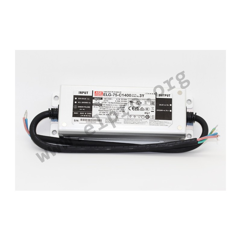 LED drivers in a metal housing (IP67) with 75W, a protective earth conductor (PE) and a constant current. These SELV compliant devices have a built-in active PFC function and are protected against overload (auto recovery), overtemperature, overvoltage as well as short circuit. They are suitable for LED lighting applications, have a fixed output current and comply with EN61347-1, EN61347-2-13, EN55015, EN61547, EN61000-3-3 as well as EN61000-3-2 class C. We offer the following types of this Mean Well series: ELG-75-C350-3Y, ELG-75-C500-3Y, ELG-75-C700-3Y, ELG-75-C1050-3Y and ELG-75-C1400-3Y.