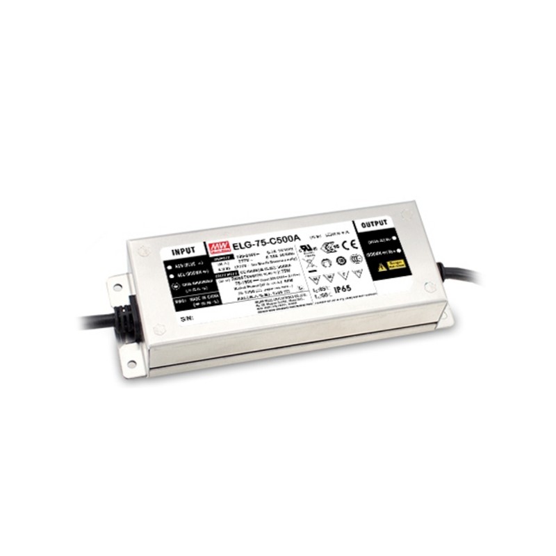 LED drivers in a metal housing (IP65) with 75W, a constant current, a 3 in 1 dimming function nad a protective earth conductor. These devices have a built-in active PFC function and are protected against overload (auto recovery), short circuit, overtemperature as well as overvoltage. They are suitable for LED lighting applications, have a potentiometer for adjusting the current limitation and comply with EN61347-1, EN61347-2-13, EN55015, EN61000-3-2 class C, EN61000-3-3 as well as EN61547. We offer the following types of this Mean Well series: ELG-75-C350AB-3Y, ELG-75-C500AB-3Y, ELG-75-C700AB-3Y, ELG-75-C1050AB-3Y and ELG-75-C1400AB-3Y.