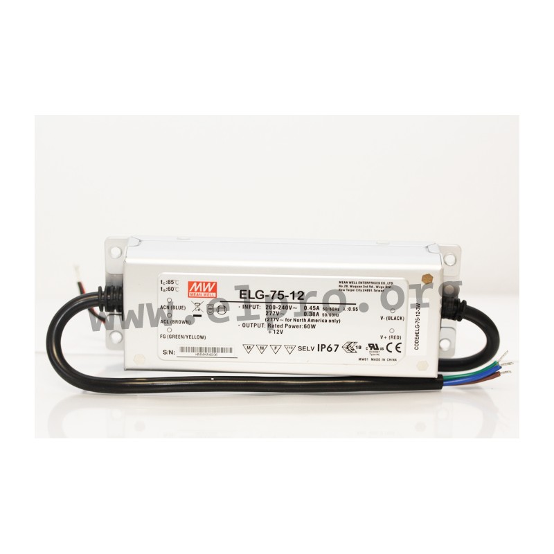 LED drivers in a metal housing (IP67) with a constant voltage, a protective earth conductor PE, 75W and a constant current. These SELV compliant devices are protected against overvoltage, overtemperature, overload (auto recovery) as well as short circuit and comply with EN61347-1, EN61347-2-13, EN55015, EN61000-3-2 class C, EN61000-3-3, EN61547 as well as a 6kV surge immunity level. They are suitable for LED lighting applications and have a built-in active PFC function. We offer the following types of this Mean Well series: ELG-75-12-3Y, ELG-75-24-3Y, ELG-75-36-3Y and ELG-75-48-3Y.