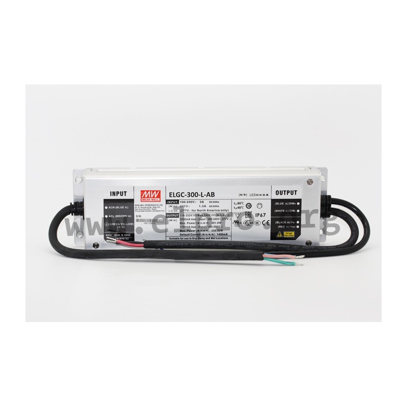 LED drivers in a metal housing (IP67) with a constant power, a 6kV surge immunity level, a 3 in 1 dimming function (0 to 10V DC, PWM, 100kOhm potentiometer) and a built-in potentiometer for adjusting the current limitation. These SELV compliant (ELGC-300-M_/ELGC-300-H_) devices are protected against overload (auto recovery), overtemperature, overvoltage as well as short circuit and are suitable for LED lighting applications. They have a built-in active PFC function and comply with EN61347-2-13, EN61347-1, EN61547, EN55015, EN61000-3-2 class C as well as EN61000-3-3. We offer the following types of this Mean Well series: ELGC-300-L-AB, ELGC-300-M-AB and ELGC-300-H-AB.
