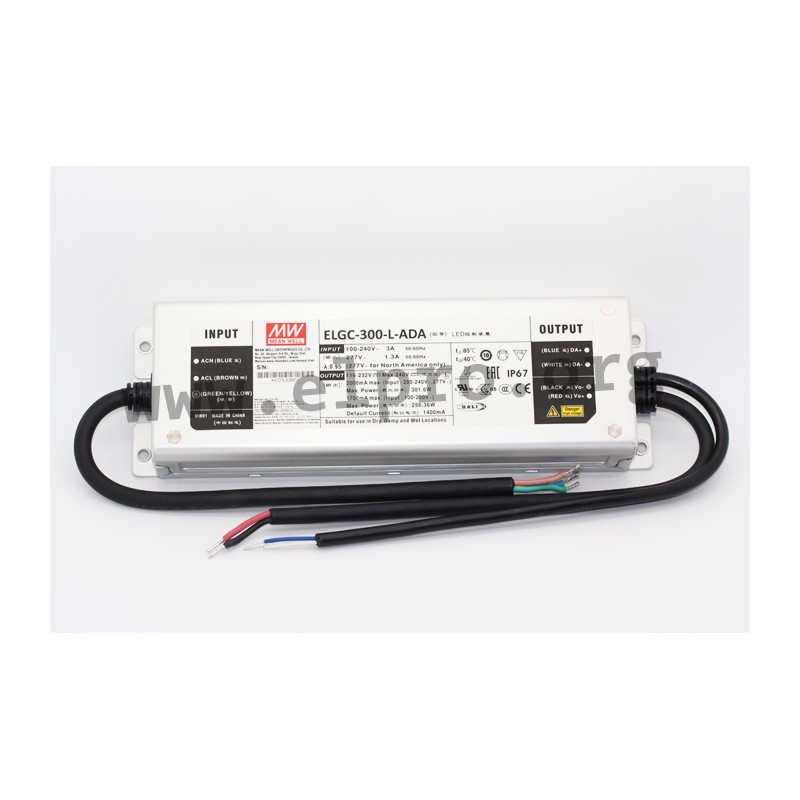 LED drivers in a metal case (IP67) with a DALI 2.0 interface, a 6kV surge immunity level, a wide input range and 300W. These SELV compliant devices are protected against short circuit, overload (auto recovery), overvoltage as well as overtemperature and comply with EN61347-1, EN61347-2-13, EN55015, EN61000-3-2 class C EN61000-3-3 as well as EN61547. They have a built-in potentiometer for adjusting the current limitation as well as a built-in active PFC function and are suitable for LED lighting applications. We offer the following types of this Mean Well series: ELGC-300-L-ADA, ELGC-300-M-ADA and ELGC-300-H-ADA.