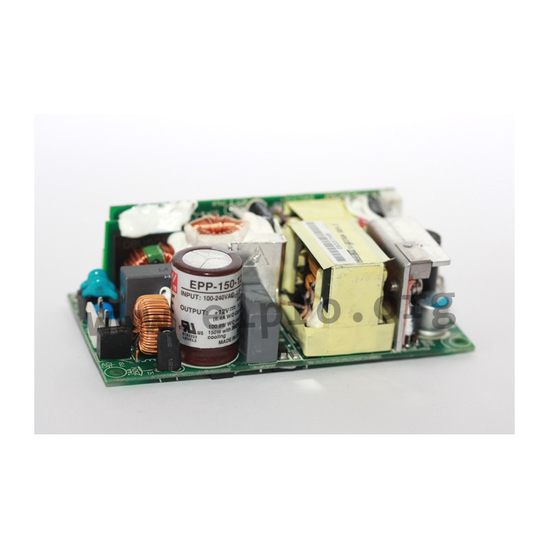 Switching power supplies in a 4"x2" housing (open frame) with 150W (20cfm forced air), a universal input, a built-in auxiliary output (12V/0,3A), a low no-load power (<0,5W) and a pin strip connection for nylon crimp terminals. These devices have a built-in active PFC function and are protected against overload (auto recovery), overvoltage as well as short circuit. They are very efficient and comply with UL/EN62368-1, EN55032 class B, EN61000-3-2 as well as EN61000-3-3. We offer the following types of this Mean Well series: EPP-150-12, EPP-150-15, EPP-150-24, EPP-150-27 and EPP-150-48.